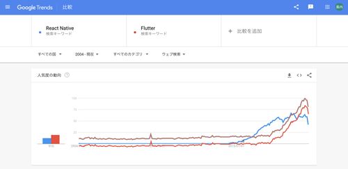 Flutter、伸びてきてます。数はReactNativeとFlutterを比較しています。Flutterというのは普通に英単語のようなので、Flutterが登場する2017年を基準に補正しています。今年になってようやくReact Nativeを抜き去り、今は少し落ちつたようです。 これは国内…